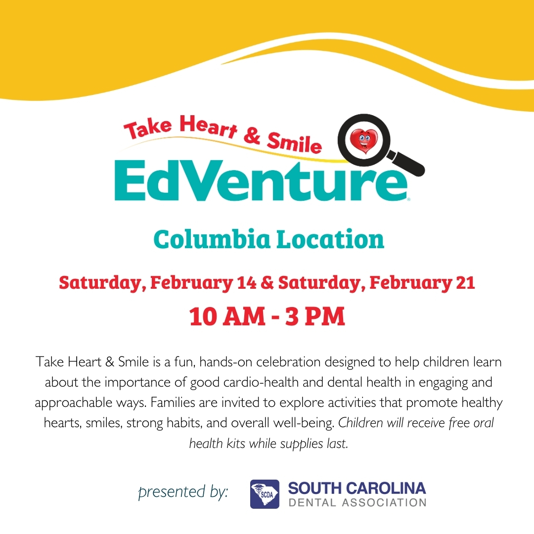 This special event takes place on two Saturdays, February 14 and February 21, from 10 AM–3 PM, and is proudly sponsored by the South Carolina Dental Association. Children will receive free oral health kits while supplies last.